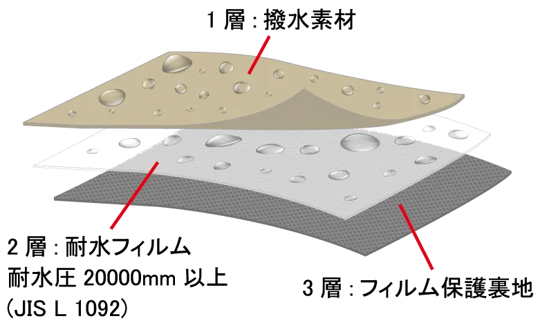 AQUA STOPPERは撥水素材、耐水フィルム、フィルム保護裏地の3枚を、ラミネート加工で貼り合わせた3レイヤー構造の素材です。耐水圧は20000mm以上。日常で雨に打たれた際に、生地からの染み込みを防ぐのに十分な耐水圧を備えています。