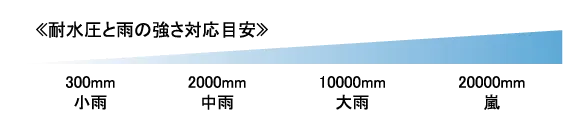 耐水性とは「生地が水を通さない性能」のこと。テントや傘以上の耐水性で、生地から雨が染み込むのを防ぎます。