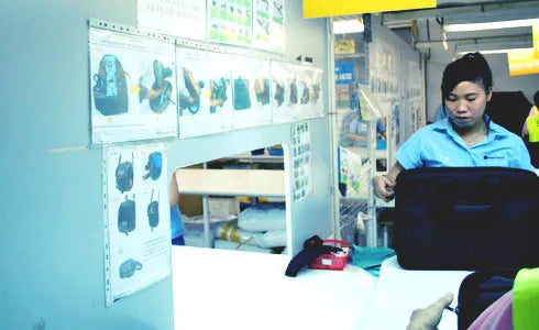 鞄は検針器を使っての検針が困難。そのため、製造の段階で針などの危険物混入を未然に防ぐことが重要です。生産工場では、針や刃物、不要な金属部品が商品に混入しないよう、「5S運動※」をベースに現場を整備し、備品の総数管理や作業エリアの区分けを徹底しています。 ※5S運動・・・整理、整頓、清掃、清潔、躾を徹底する行動指針。